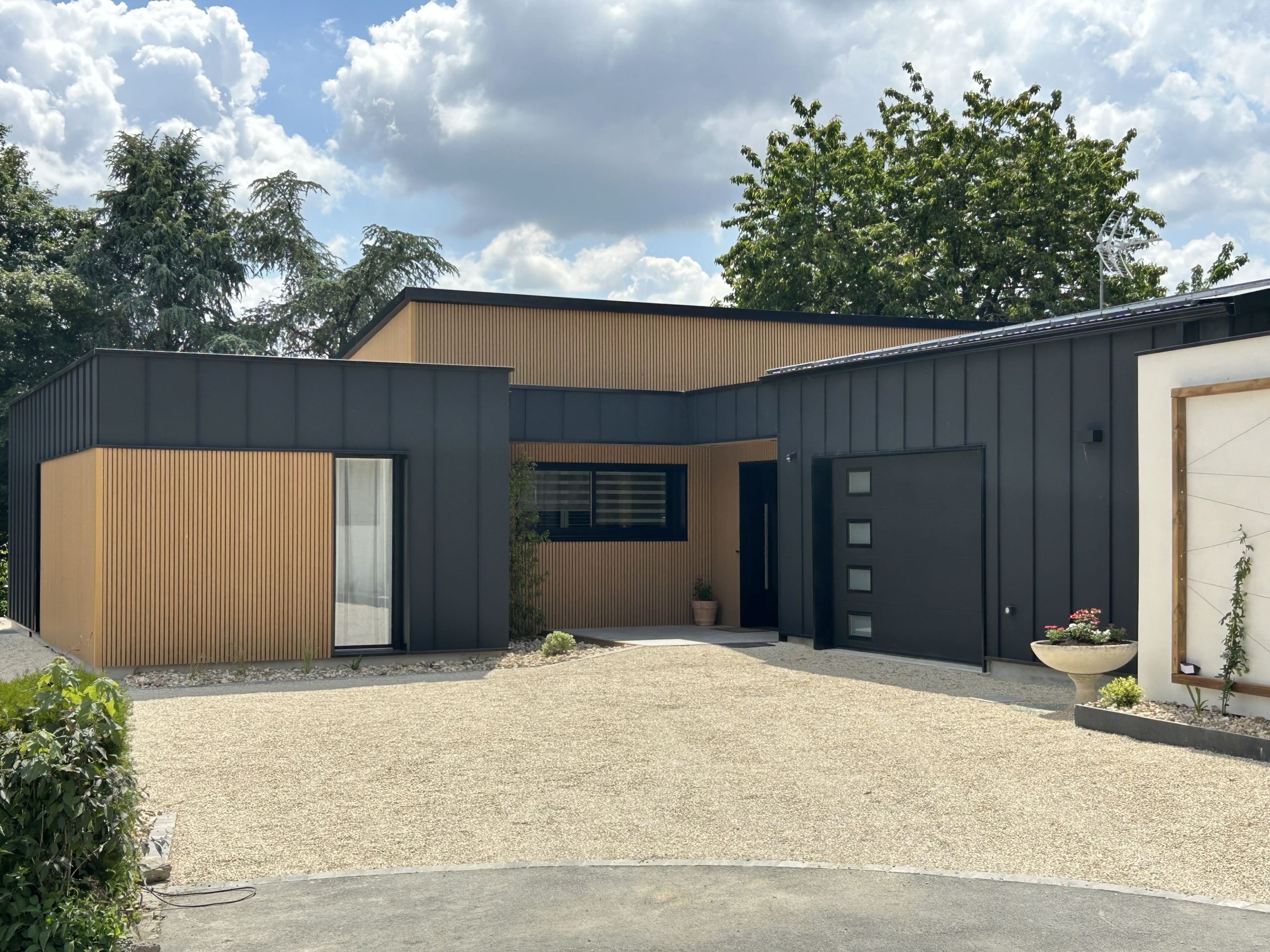 Extension de maison modulaire en bardage imitation zinc et bardage bois.
